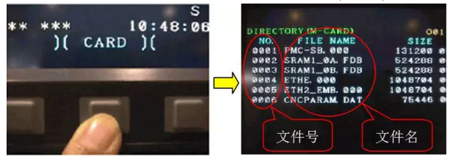?。?)查看存儲卡上的新文件。按功能鍵PROGRAM→軟鍵【列表】→【OPRT】→擴(kuò)展鍵【?】→【DEVICE】→【M CARD】, 看到DIRECTORY(M-CARD)頁面中多了一個(gè)名為“CNC-PARA.TXT”的文件,輸出成功。