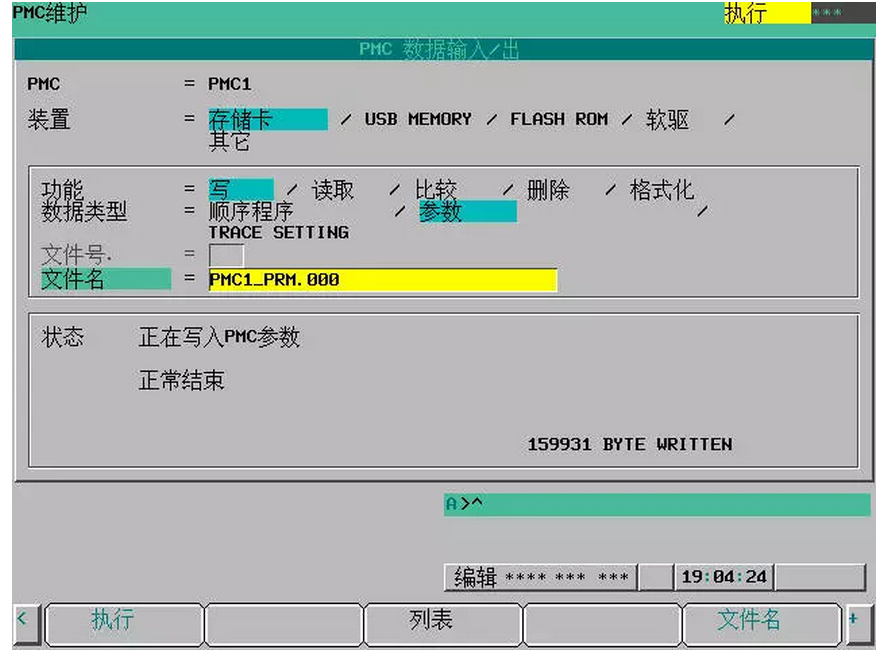 ?。?)輸出到存儲卡。按軟鍵【文件名】,生成默認(rèn)文件名“PMC1_PRM.000”,再按【EXEC】,屏幕提示“正在寫入PMC參數(shù)”;