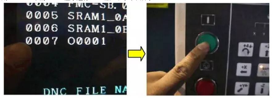 ?。?)選擇待加工程序。鍵入7(即文件號)→【DNC-ST】,此時(shí) DNC FILENAME變成O0001;